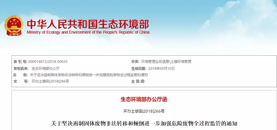 生態(tài)環(huán)境部日前印發(fā)了《關(guān)于堅(jiān)決遏制固體廢物非法轉(zhuǎn)移和傾倒 進(jìn)一步加強(qiáng)危險(xiǎn)廢物全過(guò)程監(jiān)管的通知》(環(huán)辦土壤函〔2018〕266號(hào),以下簡(jiǎn)稱《通知》)。