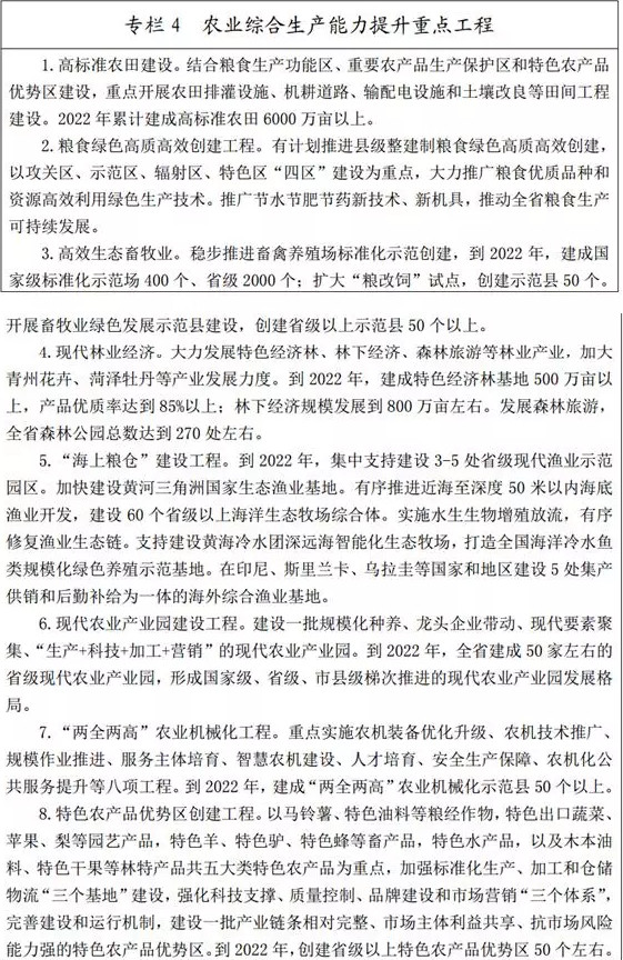 (三)提高農(nóng)業(yè)水利化機(jī)械化水平。大力實(shí)施農(nóng)田水利工程,推進(jìn)大中型灌區(qū)續(xù)建配套與節(jié)水改造,因地制宜興建、提升中小型農(nóng)田水利設(shè)施,打通農(nóng)田水利“最后一公里”,加快建設(shè)現(xiàn)代農(nóng)田灌排體系。發(fā)展節(jié)水農(nóng)業(yè)、旱作農(nóng)業(yè),加快推廣水肥一體化,加大地下水超采區(qū)綜合整治力度。2022年基本完成35處大型灌區(qū)和一批重點(diǎn)中小型灌區(qū)續(xù)建配套節(jié)水改造任務(wù),農(nóng)業(yè)灌溉水有效利用系數(shù)達(dá)到0.646,有效灌溉面積達(dá)到8000萬畝。圍繞推進(jìn)“全程、全面、高質(zhì)、高效”農(nóng)業(yè)機(jī)械化,調(diào)整優(yōu)化農(nóng)機(jī)裝備結(jié)構(gòu)布局,優(yōu)先發(fā)展大馬力、高性能、復(fù)式作業(yè)機(jī)械,大力發(fā)展智能化、高端農(nóng)機(jī)裝備。促進(jìn)農(nóng)機(jī)農(nóng)藝融合,提高農(nóng)機(jī)裝備智能決策和精準(zhǔn)作業(yè)能力,推進(jìn)糧食機(jī)械化干燥,示范推廣棉花機(jī)采、花生機(jī)播機(jī)收等關(guān)鍵環(huán)節(jié)技術(shù),推動(dòng)糧棉油等主要農(nóng)作物生產(chǎn)全程機(jī)械化。加快推廣林牧漁生產(chǎn)、病蟲害防治、節(jié)水灌溉和農(nóng)產(chǎn)品初加工機(jī)械化。2022年農(nóng)作物耕種收綜合機(jī)械化率達(dá)到88%。
