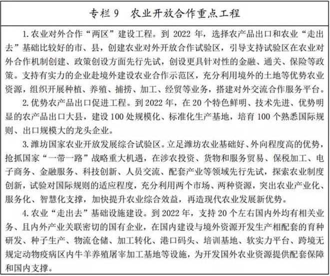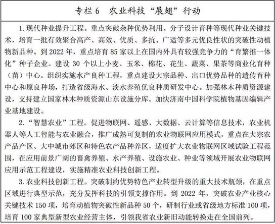 (一)提升農(nóng)業(yè)科技創(chuàng)新能力。積極爭(zhēng)取國家級(jí)涉農(nóng)科研機(jī)構(gòu)在山東布局分支機(jī)構(gòu),加快濰坊北京大學(xué)現(xiàn)代農(nóng)業(yè)研究院建設(shè)。強(qiáng)化全省農(nóng)業(yè)高校、科研院所、農(nóng)產(chǎn)品加工大企業(yè)研發(fā)中心等各類農(nóng)業(yè)科技資源整合和集成,搭建農(nóng)科教創(chuàng)新平臺(tái),建設(shè)一批省級(jí)以上農(nóng)業(yè)重點(diǎn)實(shí)驗(yàn)室和技術(shù)創(chuàng)新中心,造就一批具有較強(qiáng)國際競(jìng)爭(zhēng)力的創(chuàng)新型領(lǐng)軍企業(yè),全面提升農(nóng)業(yè)科技創(chuàng)新能力和核心競(jìng)爭(zhēng)力。多管齊下引進(jìn)對(duì)我省現(xiàn)代農(nóng)業(yè)產(chǎn)業(yè)發(fā)展有重大影響的創(chuàng)新科研團(tuán)隊(duì)和海內(nèi)外高層次農(nóng)業(yè)科技人才。通過政策扶持、項(xiàng)目匹配、資金資助等方式,深入實(shí)施農(nóng)業(yè)科研杰出人才計(jì)劃和杰出青年農(nóng)業(yè)科學(xué)家項(xiàng)目,培養(yǎng)一批科技領(lǐng)軍人才和高水平創(chuàng)新創(chuàng)業(yè)團(tuán)隊(duì)。完善首席專家、農(nóng)業(yè)技術(shù)推廣人員和新型經(jīng)營主體的聯(lián)動(dòng)機(jī)制,探索建立“創(chuàng)新團(tuán)隊(duì)+基層農(nóng)技推廣體系+新型職業(yè)農(nóng)民培育”的新型農(nóng)業(yè)科技服務(wù)模式。扎實(shí)推進(jìn)農(nóng)業(yè)科技園區(qū)體系建設(shè),提升綜合創(chuàng)新能力和服務(wù)水平。將黃河三角洲農(nóng)業(yè)高新技術(shù)產(chǎn)業(yè)示范區(qū)建成具有全國影響力的農(nóng)業(yè)科技園區(qū),在部分領(lǐng)域形成世界領(lǐng)先的高科技產(chǎn)業(yè)。到2022年,力爭(zhēng)全省農(nóng)業(yè)高新技術(shù)企業(yè)達(dá)到1000家左右,培育一批產(chǎn)業(yè)規(guī)模超10億元的優(yōu)勢(shì)產(chǎn)業(yè),形成年銷售收入超100億元的特色優(yōu)勢(shì)產(chǎn)業(yè)集群,農(nóng)業(yè)科技進(jìn)步貢獻(xiàn)率達(dá)到66%左右。
