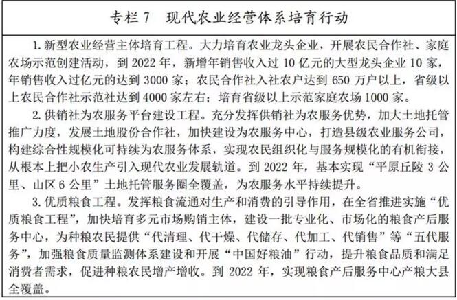(五)打造農(nóng)業(yè)“新六產(chǎn)”平臺(tái)載體。深入實(shí)施農(nóng)村產(chǎn)業(yè)融合發(fā)展“百縣千鄉(xiāng)萬村”試點(diǎn)示范工程,開展農(nóng)業(yè)“新六產(chǎn)”示范縣、示范主體創(chuàng)建,帶動(dòng)形成一批百億級(jí)、千億級(jí)農(nóng)村產(chǎn)業(yè)融合發(fā)展集群,創(chuàng)建一批國家級(jí)和省級(jí)農(nóng)村產(chǎn)業(yè)融合發(fā)展示范園、先導(dǎo)區(qū)。促進(jìn)產(chǎn)城融合發(fā)展,引導(dǎo)二三產(chǎn)業(yè)向縣城、重點(diǎn)鄉(xiāng)鎮(zhèn)及產(chǎn)業(yè)園區(qū)等集中,打造一批農(nóng)村產(chǎn)業(yè)融合領(lǐng)軍企業(yè),培育一批農(nóng)業(yè)特色小鎮(zhèn)和田園綜合體。堅(jiān)持產(chǎn)業(yè)園區(qū)、科技園區(qū)、創(chuàng)業(yè)園區(qū)“三園同建”,以園區(qū)化引領(lǐng)發(fā)展現(xiàn)代農(nóng)業(yè),融合發(fā)展關(guān)聯(lián)產(chǎn)業(yè),著力打造現(xiàn)代農(nóng)業(yè)綜合發(fā)展平臺(tái)。到2020年,農(nóng)業(yè)“新六產(chǎn)”對(duì)農(nóng)民增收貢獻(xiàn)率顯著提高,建設(shè)農(nóng)業(yè)“新六產(chǎn)”示范縣50個(gè)、示范主體600家。2022年農(nóng)業(yè)“新六產(chǎn)”發(fā)展布局基本成熟。