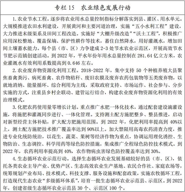(二)推進(jìn)農(nóng)業(yè)清潔生產(chǎn)。實(shí)施化肥、農(nóng)藥減量增效行動(dòng),全面推廣測(cè)土配方施肥技術(shù),強(qiáng)化化肥、農(nóng)藥、獸藥、飼料添加劑等投入品使用管理,推進(jìn)病蟲害統(tǒng)防統(tǒng)治和綠色防控。大力實(shí)施種養(yǎng)業(yè)循環(huán)一體化工程,加快規(guī)?;笄蒺B(yǎng)殖場(chǎng)區(qū)糞污處理設(shè)施建設(shè)與標(biāo)準(zhǔn)化改造,推動(dòng)規(guī)?;笮驼託饨ㄔO(shè),散養(yǎng)密集區(qū)逐步實(shí)現(xiàn)畜禽糞便污水分戶收集、集中處理利用,開展有機(jī)肥替代化肥試點(diǎn)。到2022年全省畜禽糞污綜合利用率達(dá)到81%,規(guī)模養(yǎng)殖場(chǎng)糞污處理設(shè)施裝備配套率達(dá)到100%。以縣為單位推進(jìn)農(nóng)業(yè)廢棄物資源化利用試點(diǎn),推廣秸稈高效利用模式,到2022年全省主要農(nóng)作物秸稈綜合利用率達(dá)到92%。推進(jìn)廢舊地膜、微灌材料和包裝廢棄物等回收處理,開展地膜使用全回收、機(jī)械化免膜生產(chǎn)、消除土壤殘留等試點(diǎn)。創(chuàng)建一批國家農(nóng)業(yè)可持續(xù)發(fā)展試驗(yàn)示范區(qū)。
