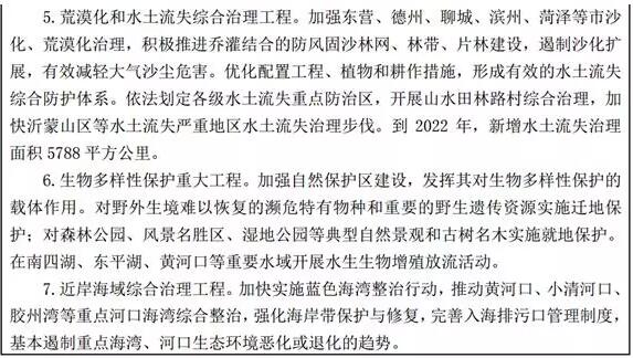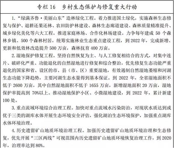 (二)實(shí)施生態(tài)修復(fù)重大工程。實(shí)施濕地修復(fù)工程,對(duì)集中連片、破碎化嚴(yán)重、功能退化的自然濕地進(jìn)行修復(fù)和綜合整治,有效遏制自然濕地萎縮和河湖生態(tài)功能下降趨勢(shì)。開展沙化荒漠化治理,以東營、德州、聊城、濱州、菏澤五市為重點(diǎn),積極推進(jìn)喬灌結(jié)合的防風(fēng)固沙林網(wǎng)、林帶、片林建設(shè)。推進(jìn)荒山、荒溝、荒灘整治修復(fù)。積極推進(jìn)泰山山水林田湖生態(tài)修復(fù)國家試點(diǎn)工程。支持長島海洋生態(tài)保護(hù)和持續(xù)發(fā)展。支持資源型城市開展生態(tài)修復(fù)工作,實(shí)施礦山環(huán)境治理恢復(fù),持續(xù)推進(jìn)采煤塌陷地治理。強(qiáng)化農(nóng)業(yè)防災(zāi)減災(zāi)能力建設(shè),提高抵御洪澇災(zāi)害、氣象災(zāi)害等應(yīng)急處置水平。