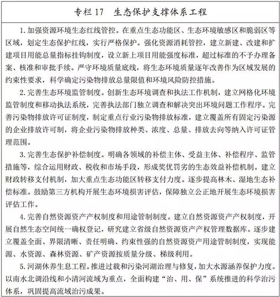 (一)健全生態(tài)保護(hù)補(bǔ)償機(jī)制。完善以政府購買服務(wù)為主的公益林管護(hù)機(jī)制,建立重點(diǎn)生態(tài)公益林補(bǔ)償標(biāo)準(zhǔn)動(dòng)態(tài)調(diào)整機(jī)制和以森林植被碳儲(chǔ)量為切入點(diǎn)的市場(chǎng)化生態(tài)保護(hù)補(bǔ)償機(jī)制,繼續(xù)實(shí)施國家、省級(jí)重點(diǎn)公益林營造、撫育、保護(hù)和管理的生態(tài)效益補(bǔ)償。在國家級(jí)濕地公園開展生態(tài)保護(hù)補(bǔ)償試點(diǎn),并逐步在省級(jí)濕地公園推廣。在確?;巨r(nóng)田保護(hù)面積不減少的前提下,將已劃入基本農(nóng)田的25度以上坡耕地逐步退出。探索市場(chǎng)化生態(tài)補(bǔ)償機(jī)制,建立健全用水權(quán)、碳排放權(quán)交易制度。研究制定市縣補(bǔ)償為主、中央和省級(jí)財(cái)政給予支持的橫向生態(tài)保護(hù)補(bǔ)償機(jī)制辦法,對(duì)現(xiàn)有生態(tài)補(bǔ)償政策進(jìn)行整合,建立生態(tài)保護(hù)紅線生態(tài)補(bǔ)償機(jī)制。探索建立流域生態(tài)補(bǔ)償機(jī)制。到2020年,實(shí)現(xiàn)全省森林、濕地等重點(diǎn)領(lǐng)域和禁止開發(fā)區(qū)域、重點(diǎn)生態(tài)功能區(qū)等重要區(qū)域生態(tài)保護(hù)補(bǔ)償全覆蓋,初步建立多元化補(bǔ)償機(jī)制,基本形成符合省情的生態(tài)保護(hù)補(bǔ)償制度體系。