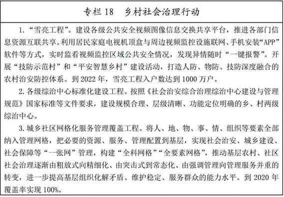 (三)全面推進(jìn)平安智慧鄉(xiāng)村建設(shè)。加強(qiáng)治安突出問題排查整治,深入開展掃黑除惡專項(xiàng)斗爭(zhēng),嚴(yán)厲打擊農(nóng)村黑惡勢(shì)力、宗族惡勢(shì)力,嚴(yán)厲打擊黃賭毒盜拐騙等違法犯罪。依法加大對(duì)農(nóng)村非法宗教活動(dòng)和境外滲透活動(dòng)打擊力度,依法制止利用宗教干預(yù)農(nóng)村公共事務(wù)。借鑒推廣浙江“楓橋經(jīng)驗(yàn)”,創(chuàng)新群眾工作方法,健全完善村居、社區(qū)人民調(diào)解組織網(wǎng)絡(luò),全面推行智慧民調(diào)系統(tǒng),善于運(yùn)用法治思維和法治方式解決涉及群眾切身利益的矛盾和問題。落實(shí)社區(qū)服刑人員、刑滿釋放人員管理制度,健全政府主導(dǎo)、社會(huì)參與、家庭扶持的幫扶機(jī)制,使其盡快融入社會(huì),預(yù)防重新違法犯罪。加強(qiáng)反邪教、社區(qū)戒毒、嚴(yán)重精神障礙患者服務(wù)管理工作,對(duì)鄉(xiāng)村留守老人、婦女兒童等強(qiáng)化服務(wù)教育,提高其自我防范意識(shí)和能力。強(qiáng)化網(wǎng)格化管理,深入實(shí)施“雪亮工程”,繼續(xù)深化平安智慧村莊(社區(qū))創(chuàng)建活動(dòng),構(gòu)建人防、技防、物防深度融合的農(nóng)村治安防控體系。強(qiáng)化鄉(xiāng)村安全生產(chǎn)監(jiān)管,防范各類事故發(fā)生。
