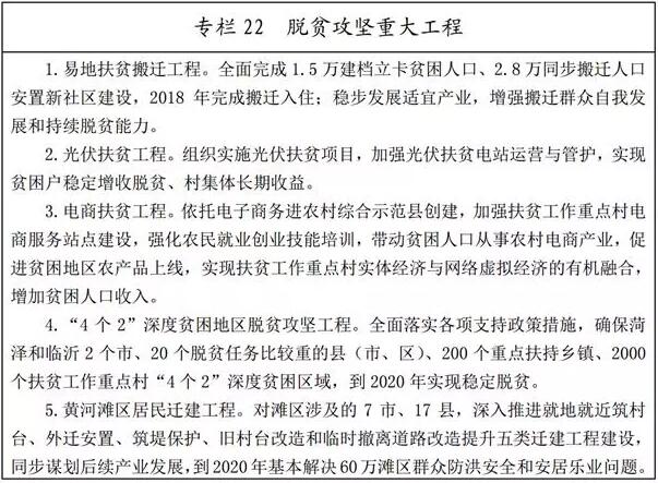 (二)聚焦深度貧困地區(qū)集中發(fā)力。加大對(duì)臨沂和菏澤2個(gè)市、20個(gè)脫貧任務(wù)比較重的縣(市、區(qū))、200個(gè)重點(diǎn)扶持鄉(xiāng)鎮(zhèn)、2000個(gè)省扶貧工作重點(diǎn)村和黃河灘區(qū)等深度貧困地區(qū)的支持力度。以解決突出制約問題為重點(diǎn),以重大扶貧工程和到村到戶幫扶為抓手,新增脫貧攻堅(jiān)資金、新增脫貧攻堅(jiān)項(xiàng)目、新增脫貧攻堅(jiān)舉措主要用于深度貧困地區(qū),著力改善發(fā)展條件,增強(qiáng)貧困群眾發(fā)展能力,攻克深度貧困堡壘。加快推進(jìn)易地扶貧搬遷,統(tǒng)籌推進(jìn)黃河灘區(qū)居民遷建工程建設(shè),推動(dòng)居民安置、產(chǎn)業(yè)培育同步規(guī)劃、同步實(shí)施,加強(qiáng)后續(xù)產(chǎn)業(yè)發(fā)展和轉(zhuǎn)移就業(yè),既讓群眾“挪窮窩”,也幫助其“撥窮根”,2018年全面完成易地扶貧搬遷任務(wù),2020年基本解決60萬灘區(qū)居民防洪安全和安居樂業(yè)問題。