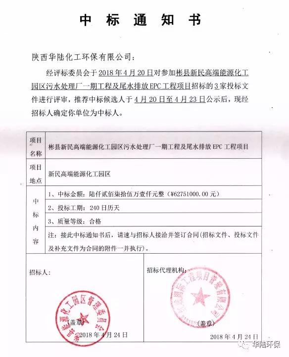 2018年4月24日,陜西華陸化工環(huán)保有限公司成功中標彬縣新民高端能源化工園區(qū)污水處理廠一期工程及尾水排放EPC工程項目(以下簡稱:中標項目),中標金額為6275.1萬元。