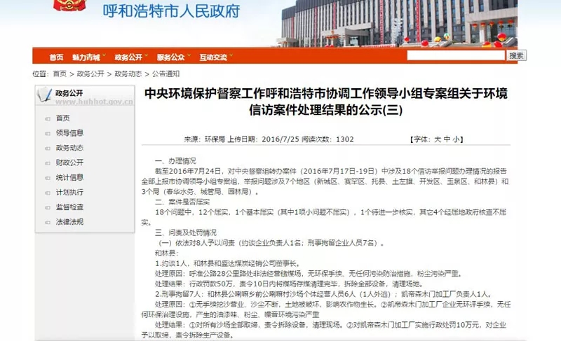 在呼和浩特市人民政府網(wǎng)站的政務(wù)公開一欄中,督察人員查閱到標(biāo)題為《中央環(huán)境保護(hù)督察工作呼和浩特市協(xié)調(diào)工作領(lǐng)導(dǎo)小組專案組關(guān)于環(huán)境信訪案件處理結(jié)果的公示(三)》的網(wǎng)頁,其中清楚地顯示對(duì)凱帝森木門加工廠的問責(zé)及處罰情況?!皠P帝森木門加工廠企業(yè)無環(huán)評(píng)手續(xù),無任何環(huán)保治理設(shè)施,產(chǎn)生的油漆味、粉塵、噪音環(huán)境污染嚴(yán)重”。處理結(jié)果是“對(duì)凱帝森木門加工廠實(shí)施行政處罰10萬元,對(duì)企業(yè)予以取締,責(zé)令拆除生產(chǎn)設(shè)備”。