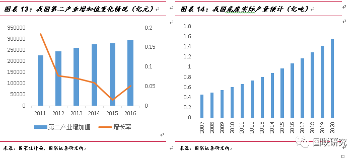 ②第二產(chǎn)業(yè)增加值測算法:由于危廢排放的企業(yè)多數(shù)來自于化工、有色等中游制造企業(yè),我們認(rèn)為危廢的實(shí)際產(chǎn)生量將與第二產(chǎn)業(yè)的景氣度是呈現(xiàn)正相關(guān)性。2007年至2016年,我國第二產(chǎn)業(yè)的增加值由11.58萬億元增長到29.65萬億元,復(fù)合增長率達(dá)9.91%,2007年污染源第一次普查時(shí)危廢實(shí)際產(chǎn)量為4573萬噸,在默認(rèn)普查數(shù)據(jù)為準(zhǔn)確數(shù)據(jù)的情況下,按照9.91%的危廢增長速率進(jìn)行測算,2016年我國危廢實(shí)際產(chǎn)生量將達(dá)到1.07億噸。