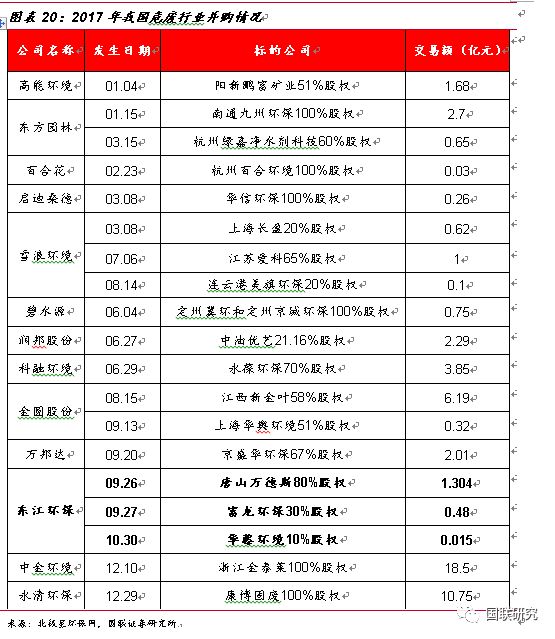 行業(yè)并購熱度高,進(jìn)入群雄逐鹿時(shí)代。在過去的2017年,我國危廢行業(yè)兼并購市場火爆,整個(gè)環(huán)保產(chǎn)業(yè)共發(fā)生86起并購,交易金額達(dá)385億元,交易金額與數(shù)量均創(chuàng)新高,其中涉及到危廢的并購市場達(dá)20余起。