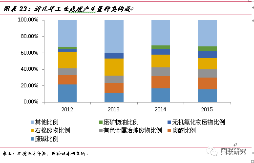 工業(yè)危廢的主要來源及種類構(gòu)成。鑒于對(duì)危險(xiǎn)廢物的認(rèn)識(shí)不斷深入,在2016年6月21日,生態(tài)環(huán)境部重新修訂了《國家危險(xiǎn)廢物名錄》,將危廢由49大類重新調(diào)整為46大類,新增117種類別,共計(jì)479種,而其中70%以上的危廢都來自于工業(yè)行業(yè)。據(jù)2015年環(huán)境統(tǒng)計(jì)年報(bào)數(shù)據(jù)統(tǒng)計(jì),工業(yè)危廢中產(chǎn)量最大的行業(yè)分別為化學(xué)原料與化學(xué)制品制造業(yè)(占比19.2%)、有色金屬冶煉和壓延加工(占比15.6%)、非金屬礦采選業(yè)(占比13.8%)以及造紙和紙制品業(yè)(占比12.7%)。