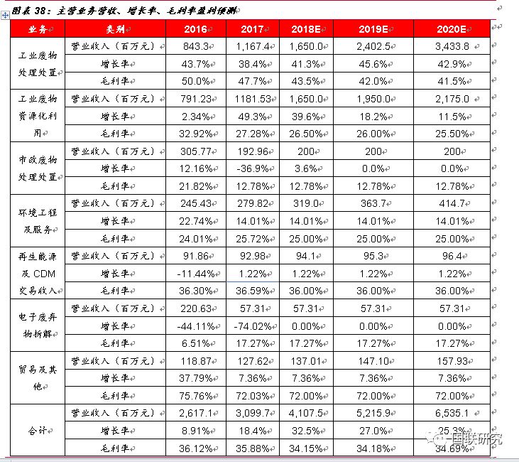 1.河北衡水睿韜項(xiàng)目(無害化)、江西固廢二期(資源化)、福建南平(無害化)、山東濰坊東江(無害化+資源化)、湖北仙桃綠怡(資源化)、江蘇南通(無害化)、泉州PPP項(xiàng)目(無害化+資源化)項(xiàng)目于2018年建成并投產(chǎn)使用。2018-2020年無害化產(chǎn)能分別為110萬噸、155萬噸、205萬噸。2.考慮到后期有部分項(xiàng)目進(jìn)行技術(shù)升級(jí)改造,以及公司正在加大物化業(yè)務(wù)市場拓展和資質(zhì)匹配,2018-2020年產(chǎn)能利用率按照60%、62%、65%進(jìn)行測算。3.由于目前危廢處置仍然存在較大的供需缺口,暫不考慮價(jià)格因素對(duì)公司收入的影響,無害化處置價(jià)格2018-2020年全部按照2500元/噸進(jìn)行預(yù)測。4.由于自2016年10月開始大宗商品價(jià)格有所回暖,近期趨于穩(wěn)定,根據(jù)上海金屬網(wǎng)價(jià)格顯示,金屬銅2016-2017年均價(jià)上漲28%,預(yù)計(jì)2017-2020年資源化產(chǎn)品價(jià)格增幅分別為14%、0%、0%、0%,均價(jià)全部按照1500元/噸進(jìn)行計(jì)算,2018-2020年資源化產(chǎn)能按照110萬噸、130萬噸、145萬噸計(jì)算。5.保守起見,暫不考慮參股海螺創(chuàng)業(yè)帶來的收入影響。