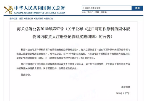 6月15日,海關(guān)總署發(fā)布今年第57號文件,根據(jù)《進(jìn)口可用作原料的固體廢物檢驗檢疫監(jiān)督管理辦法》,海關(guān)總署制定了《進(jìn)口可用作原料的固體廢物國內(nèi)收貨人注冊登記管理實施細(xì)則》,現(xiàn)予以公告,自2018年8月1日起執(zhí)行?!哆M(jìn)口可用作原料的固體廢物國內(nèi)收貨人注冊登記管理實施細(xì)則(試行)》(原質(zhì)檢總局公告2009年第91號公布)同時廢止。