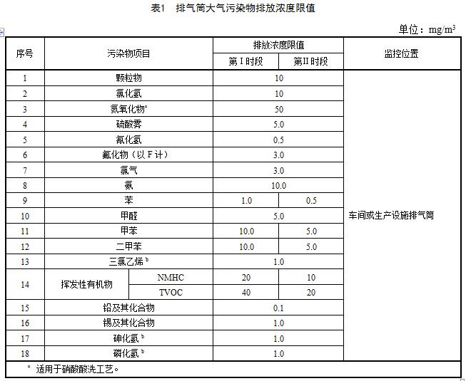 4.2.1電子工業(yè)生產(chǎn)過程中,設(shè)備或車間排氣筒排放大氣污染物濃度執(zhí)行表1規(guī)定的限值。