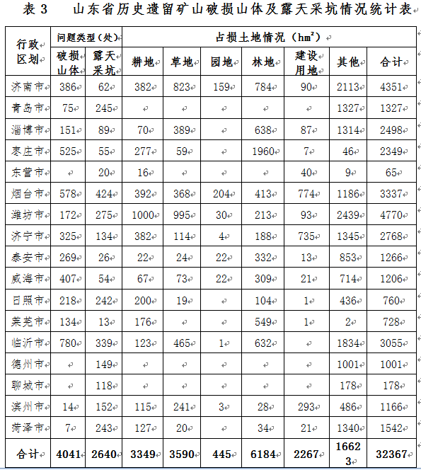 全省露天開采礦種主要有石灰?guī)r、花崗巖、磚瓦用粘土等非金屬建筑材料礦產(chǎn),在開采過程中造成了地形地貌景觀破壞,也占壓和損毀了大量的土地資源。目前,全省尚有破損山體4706處、露天采坑3109處,占損土地資源總計(jì)4.28萬公頃。其中,歷史遺留礦山破損山體4041處、露天采坑2640處,占損土地資源3.24萬公頃,主要分布在濟(jì)南、煙臺、濰坊、臨沂等地(表3);生產(chǎn)礦山造成的破損山體665處、露天采坑469處,占損土地資源1.04萬公頃,主要分布在煙臺、泰安、臨沂等地。