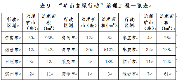 2013年全省編制實(shí)施了《山東省礦山復(fù)綠行動(dòng)實(shí)施方案》,共確定治理礦山400座,目前已治理完成254座,146座未完成。部署到2020年治理礦山146座,治理面積0.75萬公頃(含采煤塌陷地0.44萬公頃,“三區(qū)兩線”可視范圍內(nèi)歷史遺留礦山0.15萬公頃),主要分布于濟(jì)南、煙臺、濟(jì)寧、泰安等地(表9)。