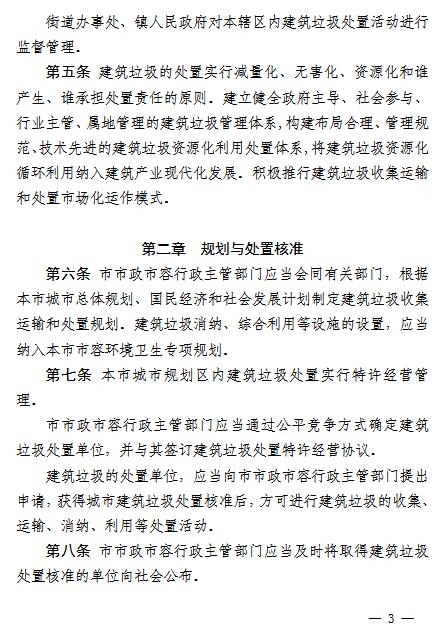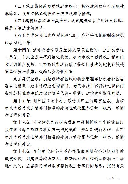 《辦法》要求,在建筑垃圾的排放上,任何單位和個人不得隨意傾倒、拋撒或者堆放建筑垃圾,不得將建筑垃圾混入生活垃圾,不得將危險廢物混入建筑垃圾,不得擅自設(shè)立棄置場受納建筑垃圾。因建設(shè)等特殊需要,確需臨時占用街道兩側(cè)和公共場地堆放的,應(yīng)當(dāng)征得??谑惺姓腥菪姓鞴懿块T同意后,按照有關(guān)規(guī)定辦理審批手續(xù)。裝修或者維修房屋排放建筑垃圾的,應(yīng)當(dāng)實行袋裝化收集;無主建筑垃圾,由垃圾所在區(qū)域的物業(yè)管理單位或者社區(qū)居委會上報各區(qū)市政市容行政主管部門;棚戶區(qū)(城中村)改造所產(chǎn)生的建筑垃圾,由海口市政市容行政主管部門核準(zhǔn)的建筑垃圾處置單位統(tǒng)一收集、運(yùn)輸和資源化處置。