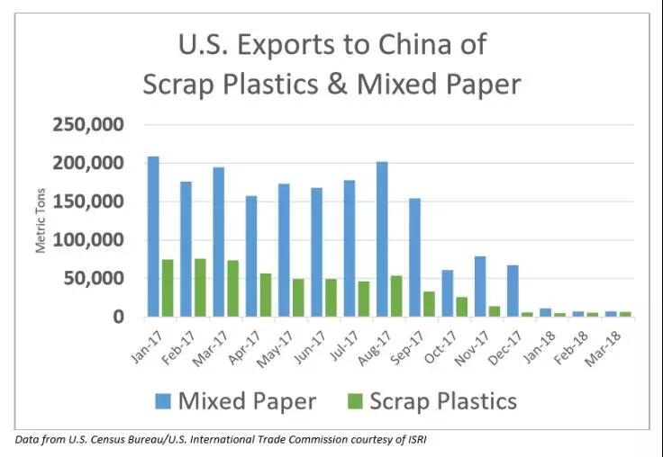 2017.1-2018.3美國出口中國的塑料廢品和紙質(zhì)廢品數(shù)量變化