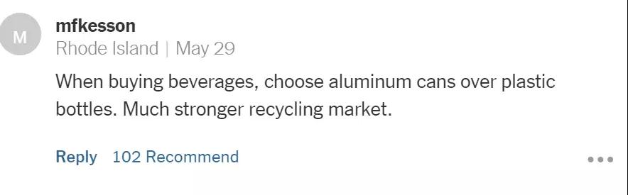 “當(dāng)我們買飲料時(shí),應(yīng)該盡量買那些鋁制罐裝的而不是塑料的。鋁材質(zhì)有著更強(qiáng)大的回收市場?!?/p>