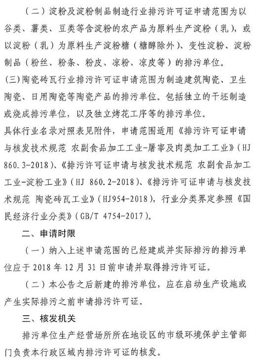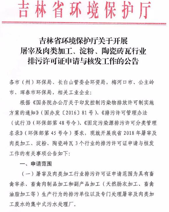 根據(jù)《國務(wù)院辦公廳關(guān)于印發(fā)控制污染物排放許可制實(shí)施方案的通知》(國辦發(fā)【2016】81號(hào))、《排污許可管理辦法試行》(環(huán)保部第48號(hào)令)、《固定污染源排污許可分類管理名錄》(環(huán)保部第45號(hào)令)要求,吉林省現(xiàn)開展2018年屠宰及肉類加工、淀粉、陶瓷磚瓦3個(gè)行業(yè)的排污許可證申請(qǐng)與核發(fā)工作。詳情如下: