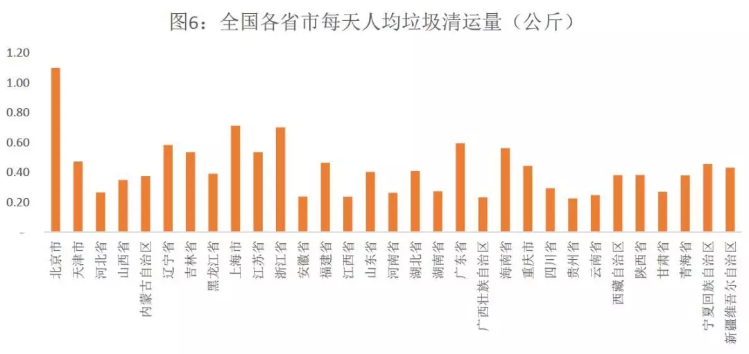 下圖為2016年全國各大省市垃圾清運(yùn)量的數(shù)據(jù),可以看出北京市以每日人均清運(yùn)1.1公斤垃圾領(lǐng)銜全國首位。該數(shù)據(jù)并不代表北京市居民一定是產(chǎn)生垃圾最多的,因?yàn)槔暹\(yùn)量與垃圾產(chǎn)生量中間有一定差異,且北京的垃圾清運(yùn)率在全國應(yīng)該是比較充分的。