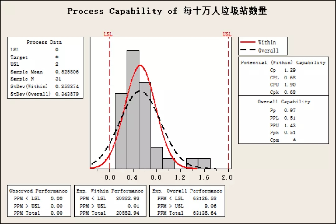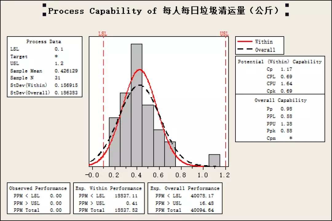 根據(jù)對(duì)每日垃圾清運(yùn)量數(shù)據(jù)的直方圖以及正態(tài)分布圖,可以看出,全國各大省市的每日人均垃圾清運(yùn)量基本符合正態(tài)分布,其中大部分省市的人均每日清運(yùn)量在0.2-0.6公斤之間,平均值為0.42公斤。