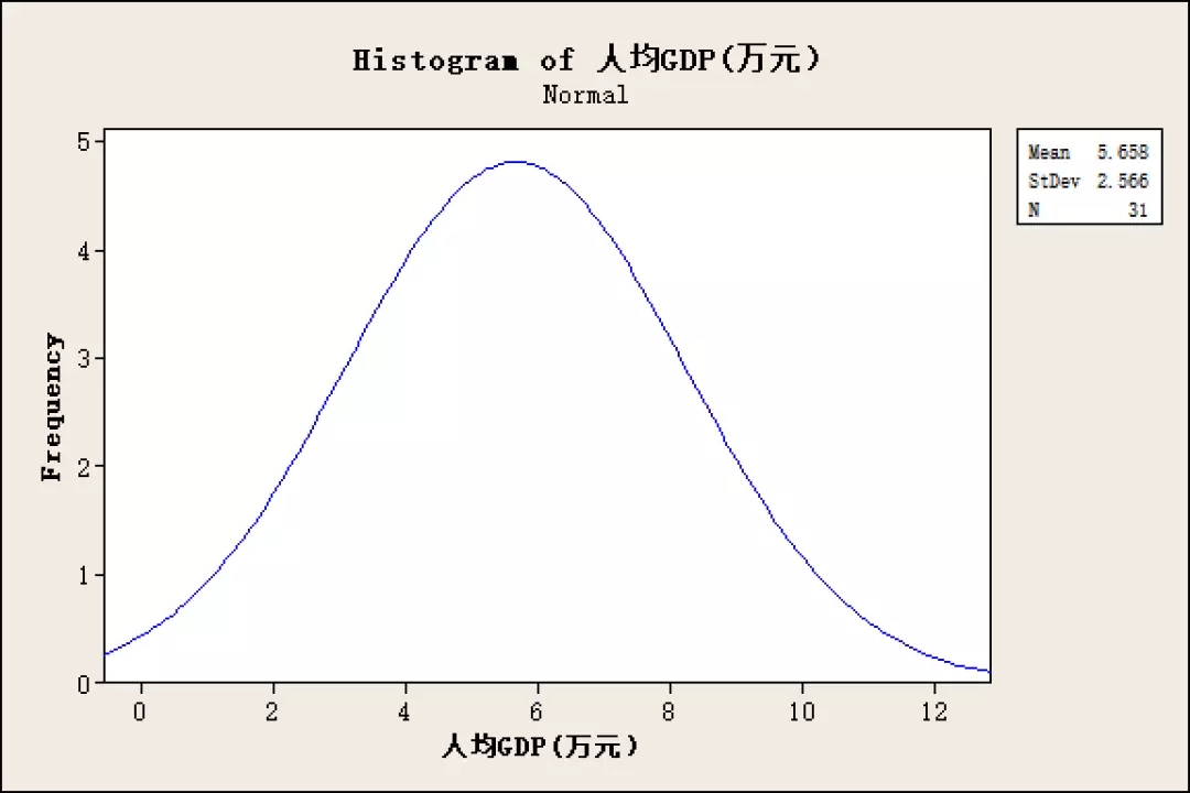 通過對(duì)全國各大省市人均GDP直方圖及正態(tài)分布圖進(jìn)行分析,人均GDP的分布也服從正態(tài)分布,大部分省市的年人均GDP位于4-7萬元區(qū)間,全國省市人均GDP均值為5.66萬元。