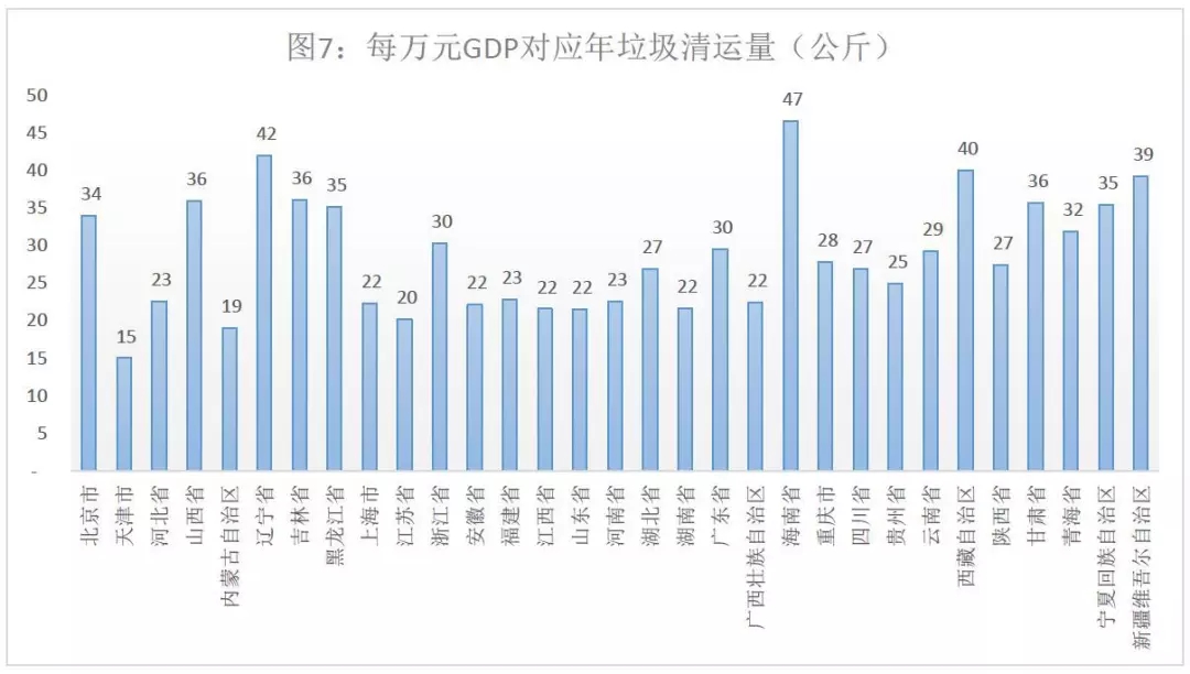 從這個(gè)角度將,海南、遼寧省每萬元GDP對(duì)應(yīng)的年垃圾清運(yùn)量分別是47、42公斤,居全國前列。天津市每萬元GDP對(duì)應(yīng)年垃圾清運(yùn)量15公斤,不考慮其他因素,單從該數(shù)據(jù)上看,天津的GDP是最“衛(wèi)生”的GDP。