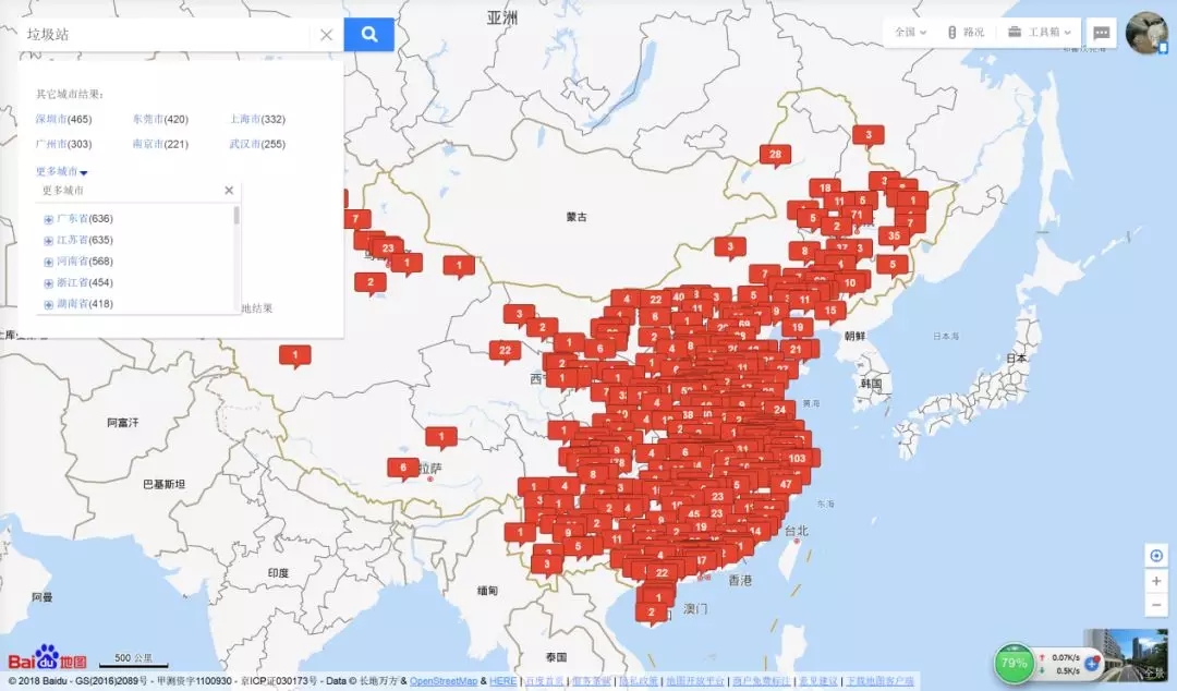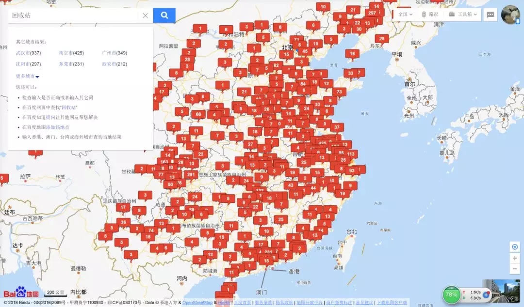 通過百度地圖對(duì)回收站及垃圾站兩個(gè)關(guān)鍵詞進(jìn)行搜索,出現(xiàn)如下兩張圖注1,垃圾站與回收站恐怕是普通居民最不愿意接觸的地方之一,但是通過百度地圖搜索,作者發(fā)現(xiàn),垃圾站和回收站幾乎是人口和經(jīng)濟(jì)的標(biāo)志之一,哪里人口密集和經(jīng)濟(jì)發(fā)達(dá),哪里的垃圾站和回收站就密集,根據(jù)對(duì)百度地圖數(shù)據(jù)統(tǒng)計(jì),全國垃圾站數(shù)量、回收站數(shù)量分別為8197個(gè)、7733個(gè),其中北京市垃圾站、回收站數(shù)量分別為130個(gè)、71個(gè)。
