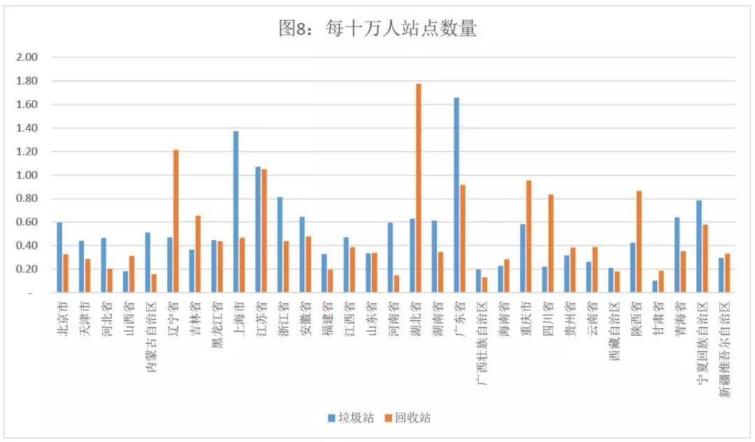 而對(duì)全國各省市每十萬人擁有的垃圾站數(shù)量及回收站數(shù)量統(tǒng)計(jì)分析,可以看出,全國大部分省市每十萬人擁有的垃圾站數(shù)量在0.3-0.7個(gè)之間,平均數(shù)為0.5個(gè);每十萬人擁有的回收站數(shù)量在0.3-0.5個(gè)之間,平均數(shù)為0.5個(gè)。
