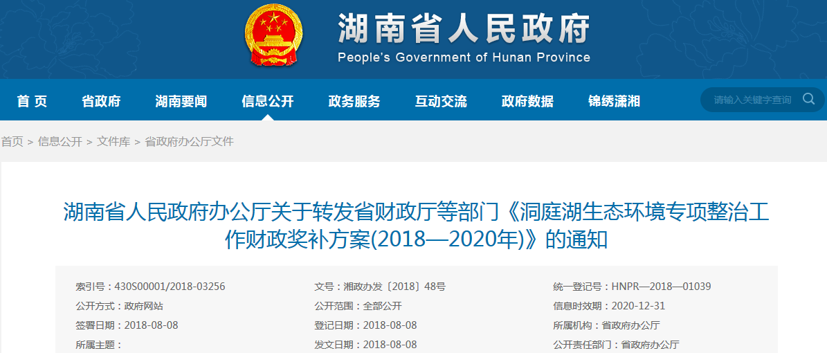 日前,湖南省人民政府辦公廳發(fā)布了關于轉(zhuǎn)發(fā)省財政廳等部門《洞庭湖生態(tài)環(huán)境專項整治工作財政獎補方案(2018—2020年)》的通知,具體內(nèi)容如下: