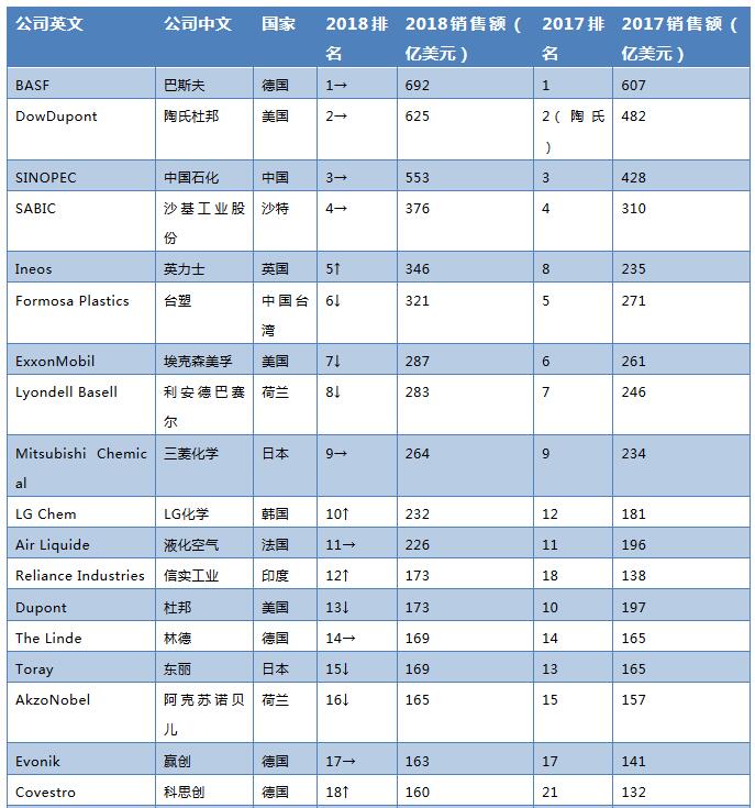 美國化學(xué)學(xué)會(AmericanChemicalSociety,ACS)旗下《化學(xué)與工程新聞》雜志(Chemical&EngineeringNews,C$EN)發(fā)布2018年度全球化工50強(C&EN’SGlobalTop50ChemicalCompanies)榜單,德國BASF公司連續(xù)12年雄踞榜首,美國DowDupont公司位居第二位,中石化集團位列第三位。