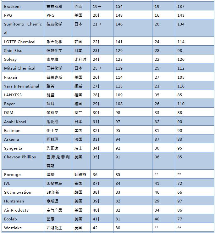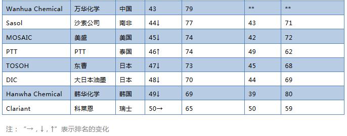 中國企業(yè)方面,除了中石化和臺塑以外,又有一家實力雄厚企業(yè)進入榜單-萬華化學(xué),另外先正達已被中國化工收購,中國上榜企業(yè)達到4家和韓國齊平。