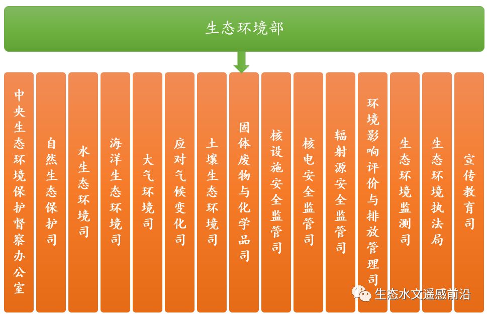 生態(tài)環(huán)境部、自然資源部、國(guó)家林業(yè)和草原局、水利部除設(shè)置辦公廳、綜合司、法規(guī)司、人事司、財(cái)務(wù)司、國(guó)際合作司、機(jī)關(guān)黨委和離退休干部辦公室等司局外,生態(tài)環(huán)境部還下設(shè)中央生態(tài)環(huán)境保護(hù)督察辦公室、自然生態(tài)保護(hù)司(生物多樣性保護(hù)辦公室、國(guó)家生物安全管理辦公室)、水生態(tài)環(huán)境司、海洋生態(tài)環(huán)境司、大氣環(huán)境司(京津冀及周邊地區(qū)大氣環(huán)境管理局)、應(yīng)對(duì)氣候變化司、土壤生態(tài)環(huán)境司、固體廢物與化學(xué)品司、核設(shè)施安全監(jiān)管司、核電安全監(jiān)管司、輻射源安全監(jiān)管司、環(huán)境影響評(píng)價(jià)與排放管理司、生態(tài)環(huán)境監(jiān)測(cè)司、生態(tài)環(huán)境執(zhí)法局、宣傳教育司等機(jī)構(gòu)。