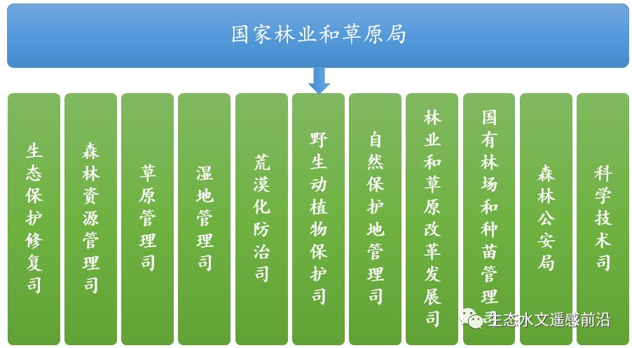 國(guó)家林業(yè)和草原局是自然資源部管理的國(guó)家局,為副部級(jí),加掛國(guó)家公園管理局的牌子。國(guó)家林業(yè)和草原局整合了國(guó)家林業(yè)局的職責(zé),農(nóng)業(yè)部的草原監(jiān)督管理職責(zé),和國(guó)土資源部、住建部、水利部等的自然保護(hù)區(qū)、風(fēng)景名勝區(qū)等管理職責(zé)。