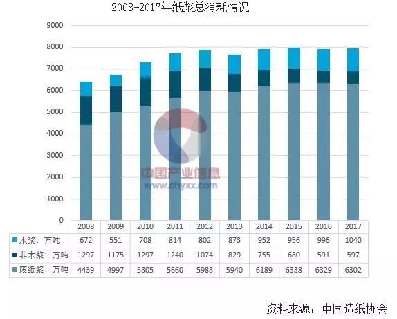 2017年全國紙漿消耗總量10051萬噸,較上年增長2.59%。木漿3152萬噸,占紙漿消耗總量31%,其中進口木漿占21%、國產(chǎn)木漿占10%;廢紙漿6302萬噸,占紙漿消耗總量63%,其中用進口廢紙制漿占21%、用國產(chǎn)廢紙制漿占42%;非木漿597萬噸,占紙漿消耗總量6%。