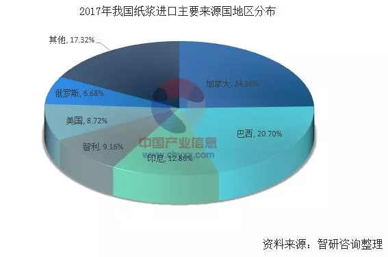 我國進口紙漿來源國較為集中。2017年我國從30多個國家和地區(qū)進口紙漿,前十大進口國合計占比在90%左右。其中加拿大為最大進口國,并維持高速增長態(tài)勢,巴西、印尼也同樣增速明顯,抵消了美國、芬蘭等國的進口量下降,整體進口量維持上漲。