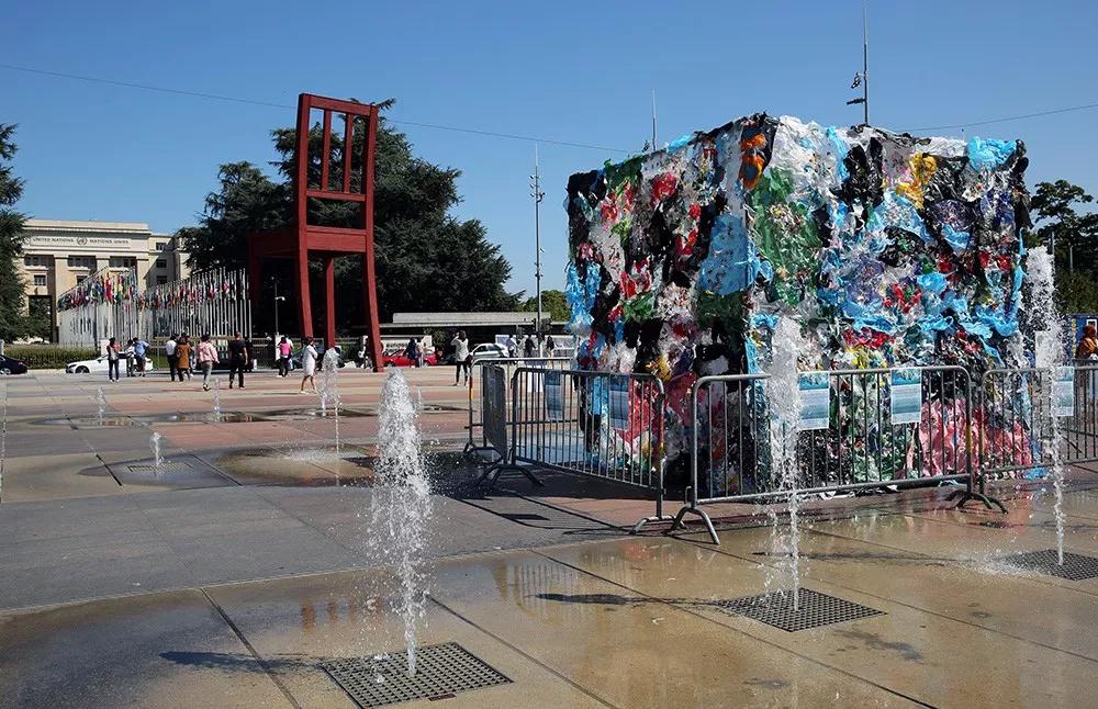 配圖:工作組會議期間,日內(nèi)瓦萬國宮外的塑料垃圾“立方”,提醒人們塑料垃圾問題的嚴(yán)重性。