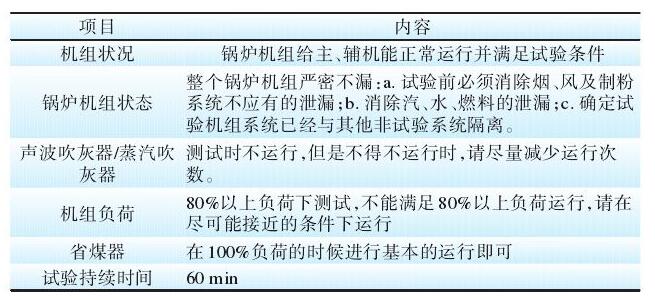 為了滿足測試的要求使測試結(jié)果準(zhǔn)確對電廠的運(yùn)行條件有一定的要求,如表1所示