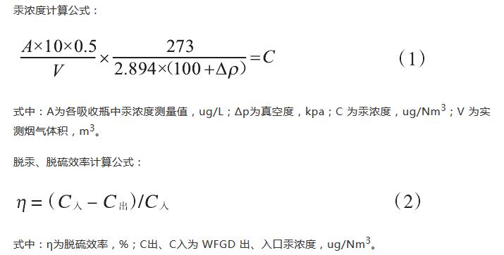 如圖 1 所示,采樣測點(diǎn)分別布置在 WFGD 入口和出口處。測試總汞的含量和煙氣中二氧化硫的濃度,用于判斷增效劑對脫汞和脫硫效率的影響。測試二氧化硫濃度時(shí)將煙氣分析儀連接煙道取樣點(diǎn),調(diào)試好儀器,取三個(gè)點(diǎn)分別測試二氧化硫的濃度,將測試結(jié)果進(jìn)行記錄匯總。測試總汞濃度時(shí),將測試儀器連接就緒,選取 3 個(gè)點(diǎn)進(jìn)行測試,測試結(jié)束后將樣品回收,放入密封瓶內(nèi)保存,等待進(jìn)一步分析。