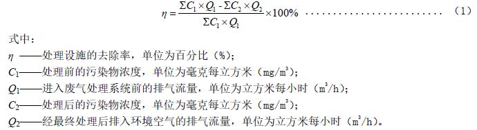 5.2.4 去除率可通過同時(shí)測(cè)定處理前后廢氣中污染物的排放濃度和排氣量,以被去除的污染物與處理之前的污染物的質(zhì)量百分比計(jì),計(jì)算方法見式(1)。