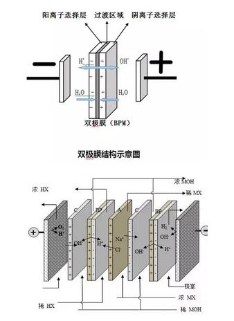 雙極膜亦稱雙極性膜,是特種離子交換膜,它是由一張陽(yáng)膜和一張陰膜復(fù)合制成的陰、陽(yáng)復(fù)合膜。該膜的特點(diǎn)是在直流電場(chǎng)的作用下,陰、陽(yáng)膜復(fù)合層間的H2O解離成H+和OH-并分別通過(guò)陰膜和陽(yáng)膜,作為H+和OH-離子源。在水處理中主要通過(guò)離子交換達(dá)到凈化水資源的目的。