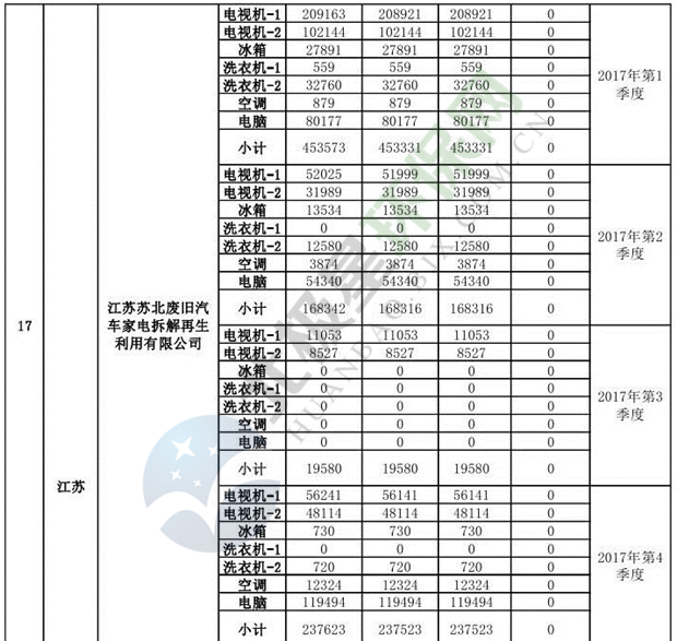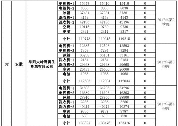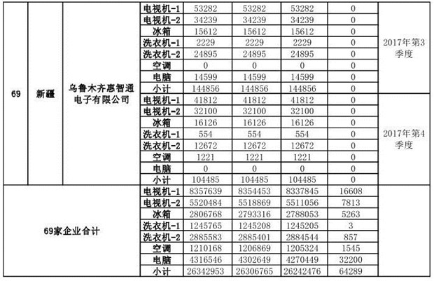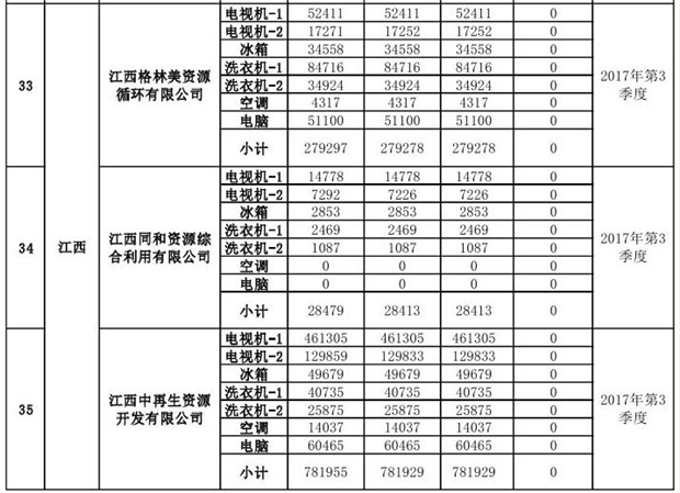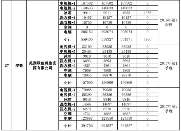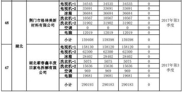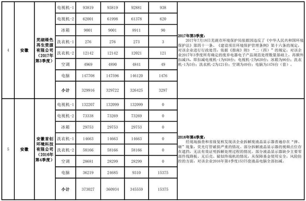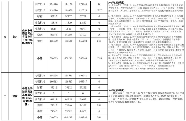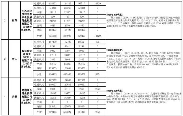 上述69家通過技術(shù)復(fù)核的企業(yè)申請廢電器規(guī)范拆解處理數(shù)量為26342953 臺(套);經(jīng)省級環(huán)保部門審核認(rèn)定廢電器規(guī)范拆解處理數(shù)量為26306765臺(套),扣減36188臺(套);部固管中心通過技術(shù)復(fù)核擬確認(rèn)廢電器規(guī)范拆解處理數(shù)量為26242476臺(套),扣減64289臺(套)(詳見附件)。
