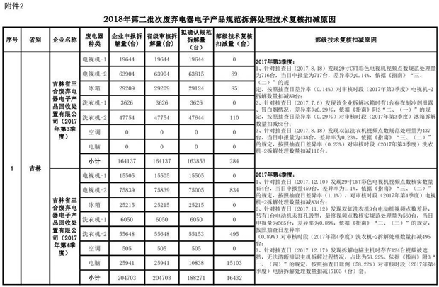 附件2:《2018年第二批次廢棄電器電子產(chǎn)品規(guī)范拆解處理技術(shù)復(fù)核扣減原因公示表》