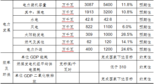 能源生產(chǎn)供給能力進一步提高。原煤生產(chǎn)能力1.2億噸左右;電力總裝機5400萬千瓦左右,其中,燃煤火電3200萬千瓦,非化石能源發(fā)電裝機2100萬千瓦、水電42.6萬千瓦、燃氣及其他發(fā)電120萬千瓦;煤制油品400萬噸;一次原油加工能力1200萬噸。