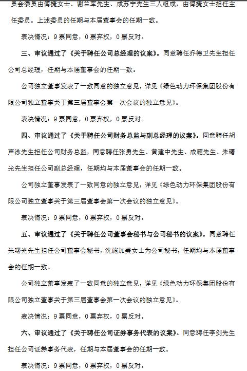 綠色動力環(huán)保發(fā)布公告,公司董事會審議通過了《關于選舉公司第三屆董事會董事長的議案》。選舉董事直軍擔任公司第三屆董事會董事長;審議通過了《關于聘任公司總經(jīng)理的議案》。同意聘任喬德衛(wèi)擔任公司總經(jīng)理;審議通過了《關于聘任公司財務總監(jiān)與副總經(jīng)理的議案》。同意聘任胡聲泳擔任公司財務總監(jiān),同意聘任張勇、黃建中、成雁、朱曙光擔任公司副總經(jīng)理。