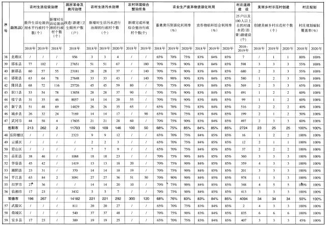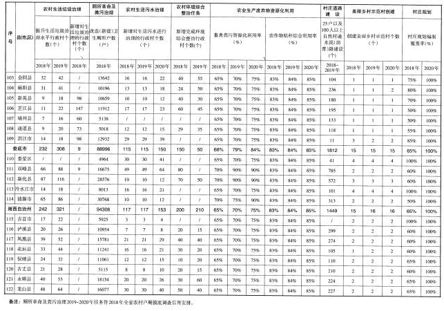 (五)著力提升村容村貌。實(shí)施“農(nóng)村公共空間整治工程”,整治集鎮(zhèn)亂搭亂建、占道經(jīng)營等現(xiàn)象,整治村莊公共空間和庭院環(huán)境,及時(shí)清理私搭亂建、亂堆亂放,開展“空心房”整治,拆除殘?jiān)珨啾?,?fù)耕復(fù)綠,堅(jiān)持“一戶一宅”“建新拆舊”。鼓勵創(chuàng)新,依托互聯(lián)網(wǎng)和專業(yè)化公司,探索農(nóng)戶閑置房屋多元化利用。加快推進(jìn)通村組道路建設(shè),完成3.3萬個(gè)25戶以及100人以上的自然村通水泥(瀝青)路建設(shè)任務(wù)。充分利用本地資源,因地制宜選擇路面材料,加快推進(jìn)入戶道路建設(shè)。實(shí)施“湖湘農(nóng)民新居工程”,提升農(nóng)村建筑風(fēng)貌,推動建設(shè)具有地域特點(diǎn)、民族特色和時(shí)代特征的農(nóng)村建筑。實(shí)施“傳統(tǒng)村落保護(hù)工程”,傳統(tǒng)村落、民居保護(hù)機(jī)制全面形成,歷史文化名鎮(zhèn)名村得到有效保護(hù)。實(shí)施“農(nóng)村美化綠化氣化工程”,引導(dǎo)各地選用本地鄉(xiāng)土樹種,在村莊周邊、庭院宅旁、村內(nèi)道路河渠兩側(cè)栽植樹木,村莊綠化覆蓋率達(dá)到30%以上,70%以上村莊達(dá)到綠色村莊標(biāo)準(zhǔn)。對村莊古樹名木掛牌建檔,挖掘和發(fā)揮古樹名木的歷史文化和景觀價(jià)值。積極引導(dǎo)和推動在村莊主要出入口、主干道和公共活動空間合理設(shè)置路燈。開展城鄉(xiāng)環(huán)境衛(wèi)生整潔行動,推進(jìn)衛(wèi)生縣城、衛(wèi)生鄉(xiāng)鎮(zhèn)等衛(wèi)生創(chuàng)建活動。深入推進(jìn)“百城千鎮(zhèn)萬村”新農(nóng)村建設(shè)工程,重點(diǎn)開展美麗鄉(xiāng)村示范村創(chuàng)建和縣鄉(xiāng)全域推進(jìn)試點(diǎn)工作。持續(xù)推進(jìn)農(nóng)村環(huán)境綜合整治全省域覆蓋工作。2018年,完成1.8萬個(gè)自然村道路建設(shè),完成3000個(gè)村的農(nóng)村環(huán)境綜合整治任務(wù)。2019年,完成1.5萬個(gè)自然村道路建設(shè),完成2000個(gè)村的農(nóng)村環(huán)境綜合整治任務(wù)。2020年,全面完成農(nóng)村環(huán)境綜合整治全省域覆蓋工作任務(wù)。