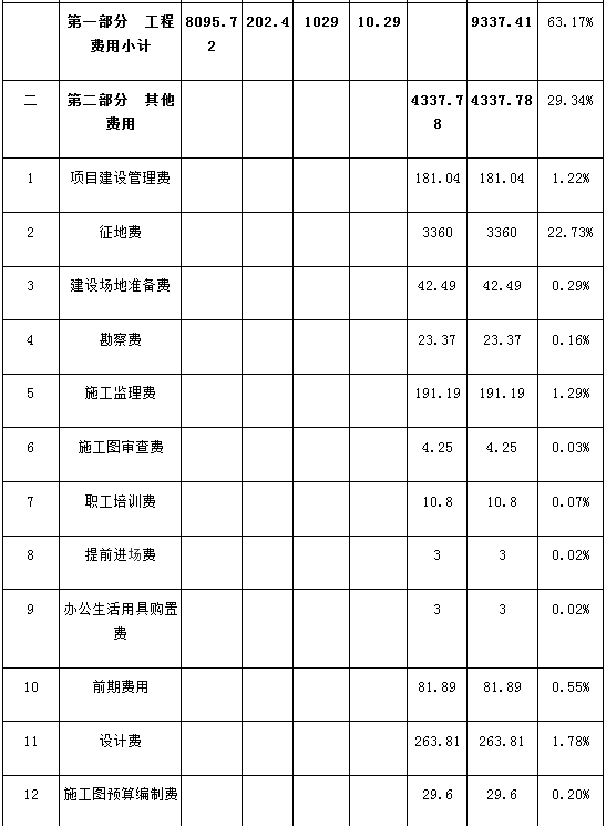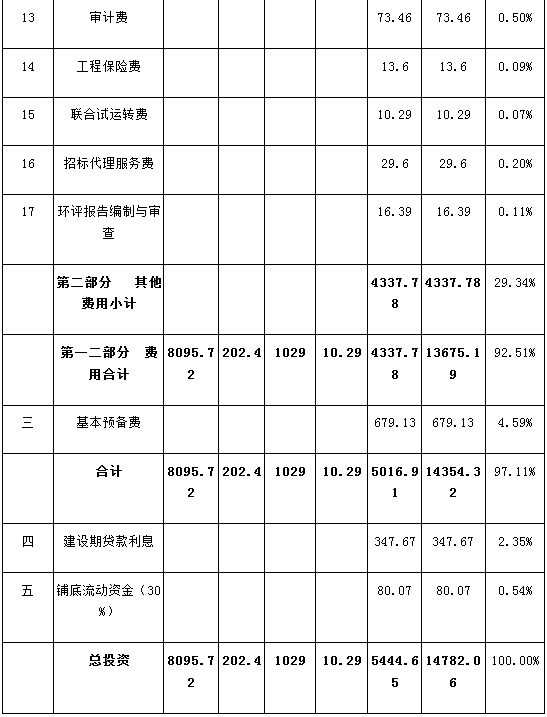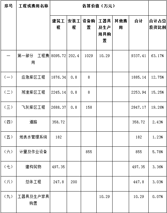 根據(jù)《揚(yáng)州市趙莊垃圾衛(wèi)生填埋場(chǎng)二期工程可行性研究報(bào)告》,本項(xiàng)目總投資為14782.06萬元,主要包括工程費(fèi)用9337.41萬元、工程建設(shè)其他費(fèi)用4337.78萬元、基本預(yù)備費(fèi)679.13萬元、建設(shè)期貸款利息347.67萬元、鋪底流動(dòng)資金80.07萬元。見表一