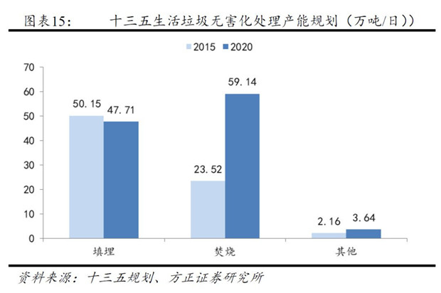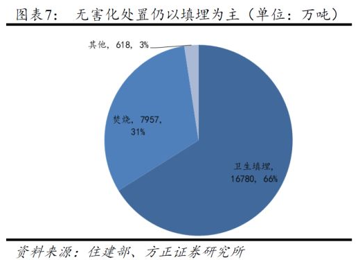細分來看,無害化處置中填埋、焚燒、其他方式年處置量分別為1.68億噸、0.80億噸、0.06億噸,占比分別為66%、31%和2%,衛(wèi)生填埋仍然是無害化處置的主流方式。
