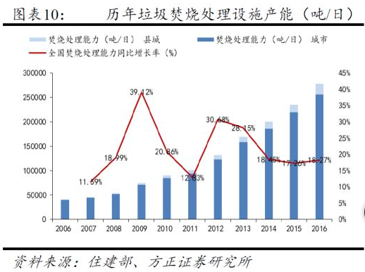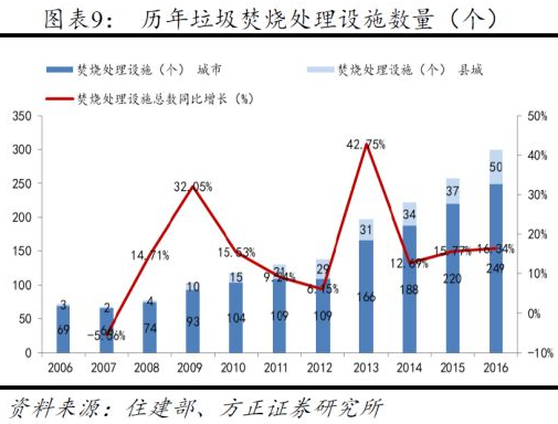 從2005年開始,BOT模式在垃圾焚燒行業(yè)開始大規(guī)模推廣,根據(jù)住建部的統(tǒng)計年鑒,2016年全國生活垃圾焚燒處理設(shè)施數(shù)量達到299個,同比增長16.34%;生活垃圾焚燒處理能力達到27.82萬噸/日,同比增長18.28%。2012-2016年年均復(fù)合增速20%左右。