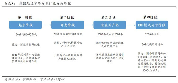 我國垃圾焚燒發(fā)電行業(yè)起步于20世80年代末,通過引進國外先進的焚燒設(shè)備和技術(shù),消化吸收優(yōu)化,先后經(jīng)歷了產(chǎn)業(yè)化研發(fā)、裝置國產(chǎn)化等階段。